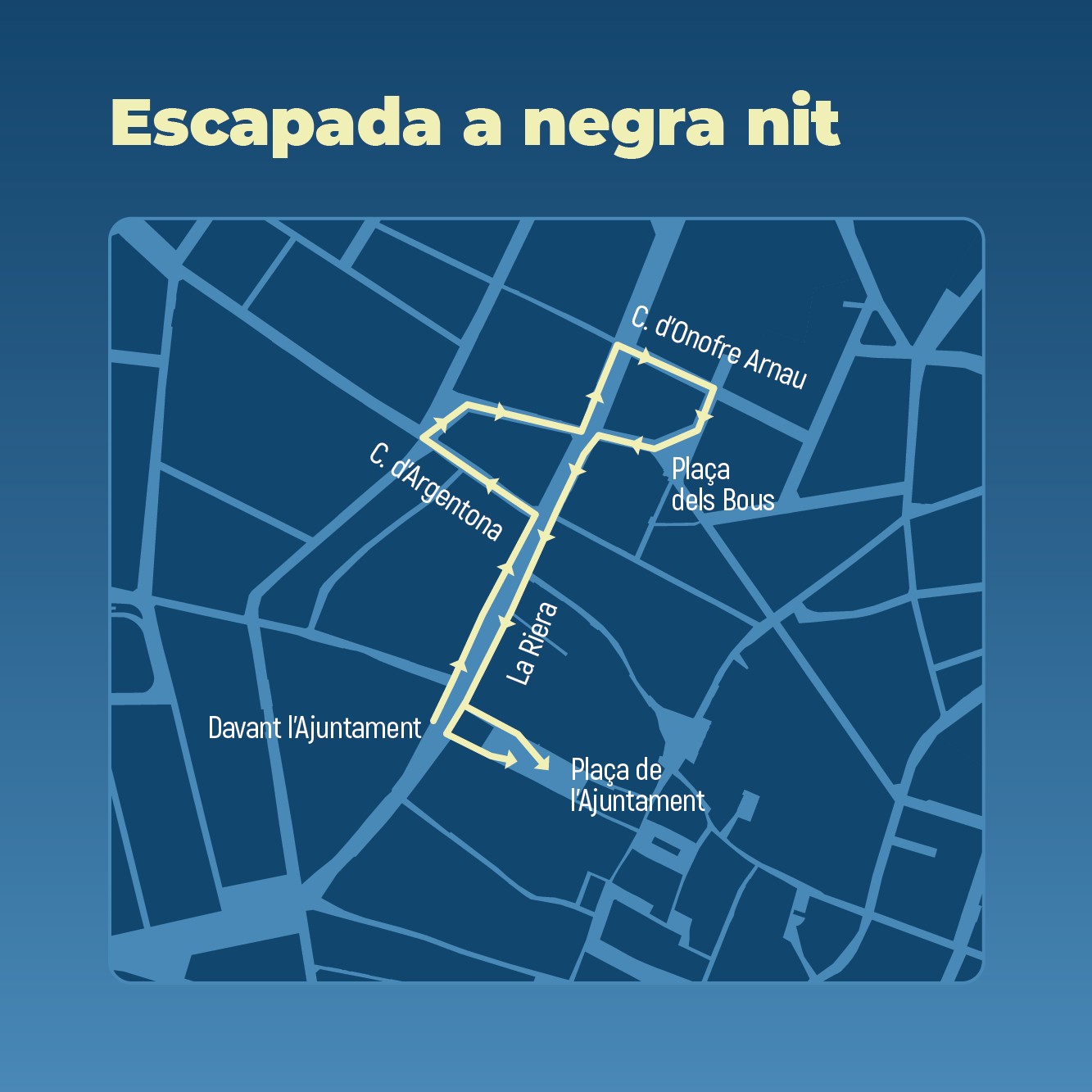 Recorregut: La Riera, carrer d’Argentona, Caminet de les Vinyes, Muralla de la Presó, La Riera, carrer d’Onofre Arnau, carrer del Bisbe Mas, plaça dels Bous, Muralla dels Genovesos, La Riera, plaça de l’Ajuntament.